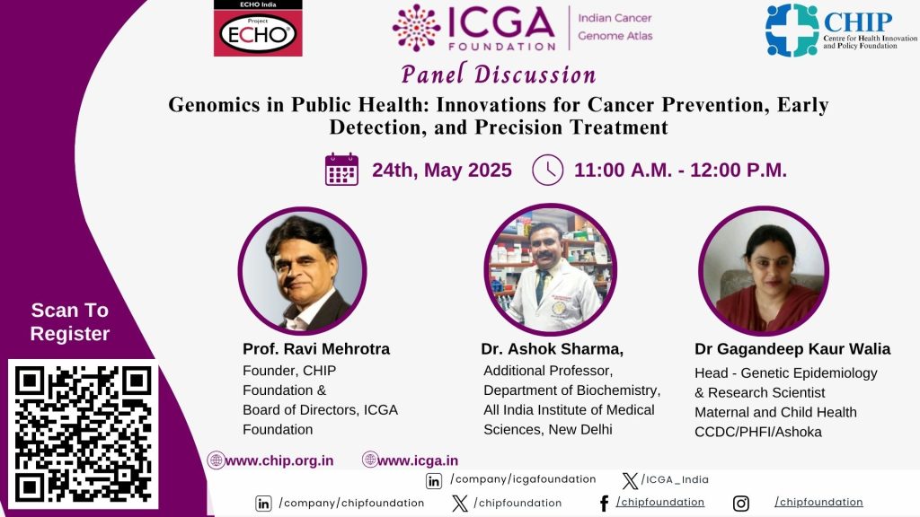 Genomics in Public Health: Innovations for Cancer Prevention, Early Detection, and Precision Treatment. In collaboration with the Indian Cancer Genome Atlas (ICGA) Foundation & ECHO India. Uncover how groundbreaking genomics is reshaping cancer care—from prevention and early diagnosis to targeted, precision treatments. Join us for an engaging discussion with some of the foremost experts in the field.
